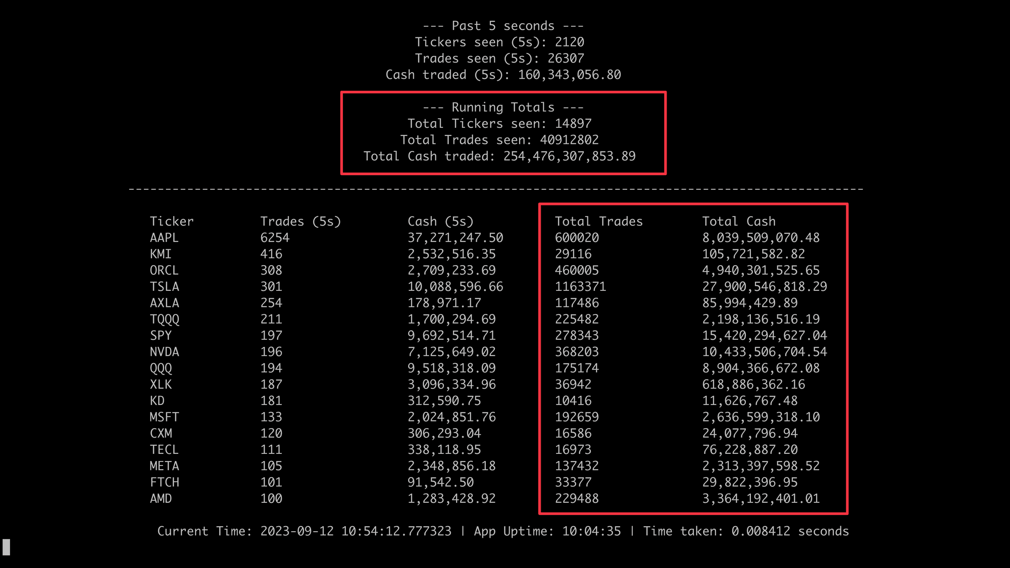 Beyond the immediate 5-second window, the application maintains an ongoing tally termed "Running Totals". This tracks the total number of unique tickers seen since the app started, the grand total of trades, and the cumulative cash value across all these trades. These running totals give users a broader perspective on market activity over time, highlighting the most consistently traded stocks and their cumulative financial impact.