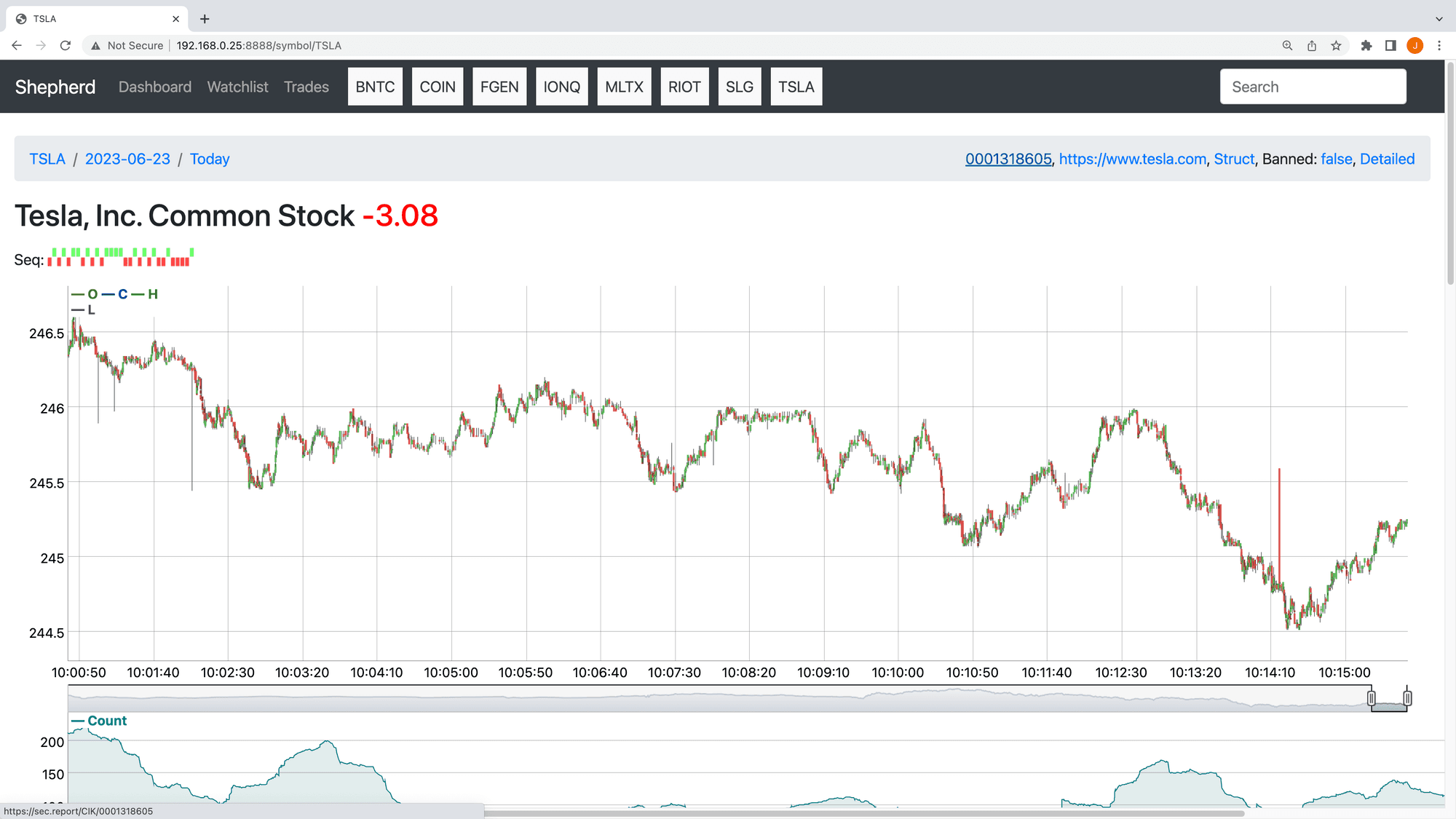 This is a specific symbol page for Tesla (TSLA), showing tick bars and other pertinent information.