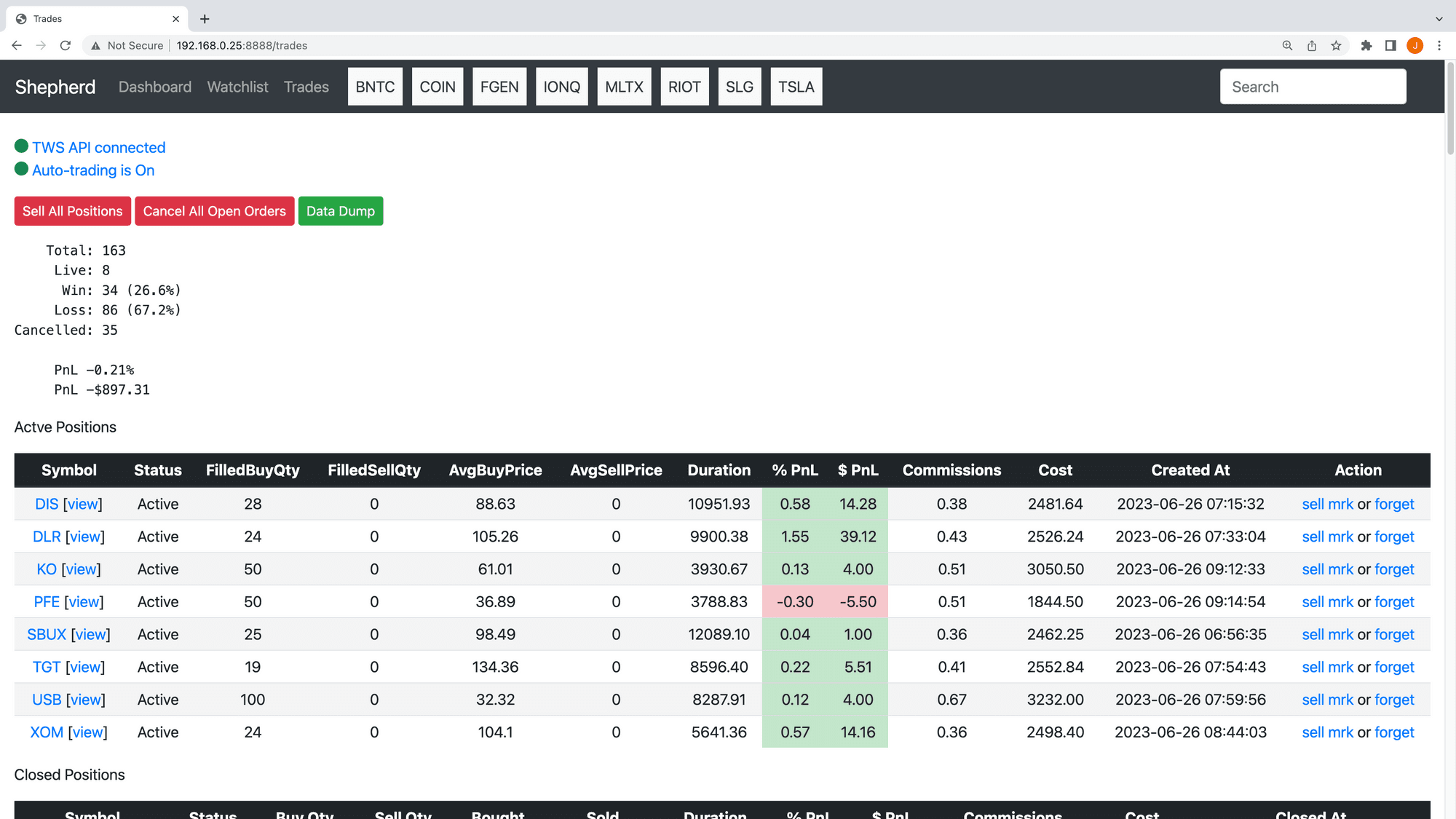 This interface displays the win/loss ratios and current open positions for active trades. You can see for this session we're down about -$900. This bot doesn't win all the time that's for sure.