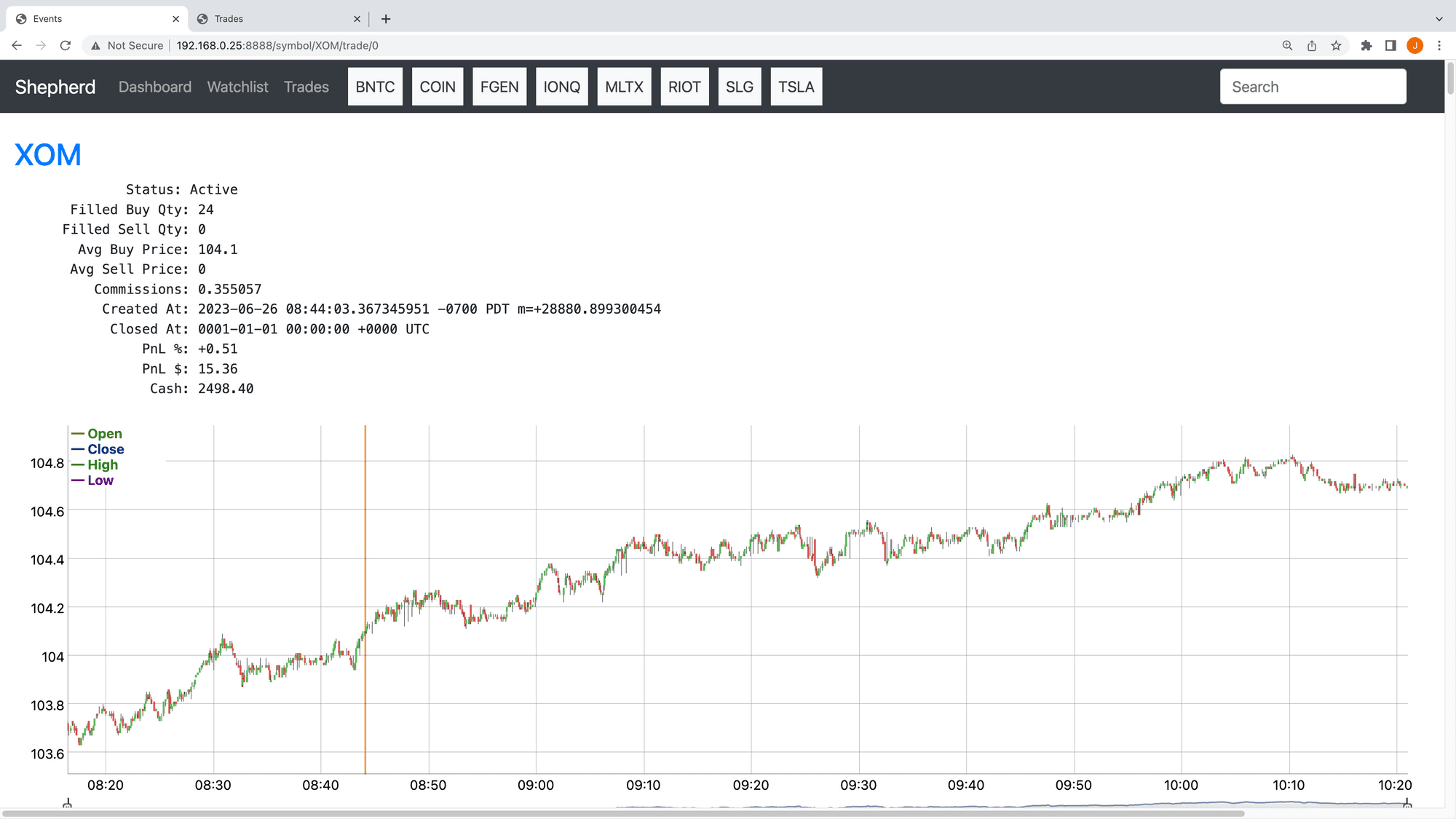 Here you'll see a live trade in action, complete with all its associated metadata and an accompanying chart to visualize the trade's progress. The orange line is where we bought 24 shares.