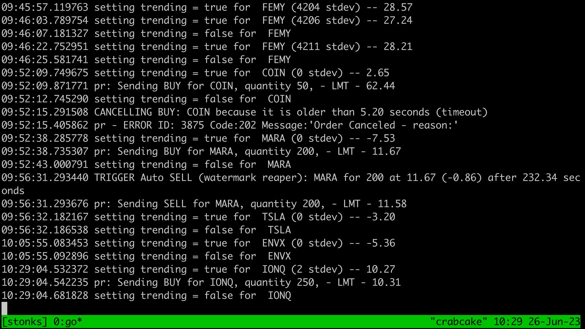 • Going In-Memory: In the early stages, I faced numerous challenges attempting to maintain state in a database because of the large spikes in activity around market open and close. Eventually, I decided to go entirely in-memory, utilizing a large map with mutex locking that virtually every component of my system interacts with. Although it was very challenging to construct and debug, this solution ultimately solved all my scalability issues. I configured the system to dump the struct that holds all data into a compressed gob file for storage, with a method to reload it in case I needed to restart the application. It can grow to be 40GB+ throughout the day and I needed to patch the Go build to support dumping gobs this large. This ensured no loss of my stateful data. Another lesson learned the hard way was the need for uninterruptible power supply. I found this out when a power outage occurred while my system was live. Without power, I lost all state data, leaving my positions unmonitored. A proper power backup system became a necessity to prevent such incidents from occurring in the future.