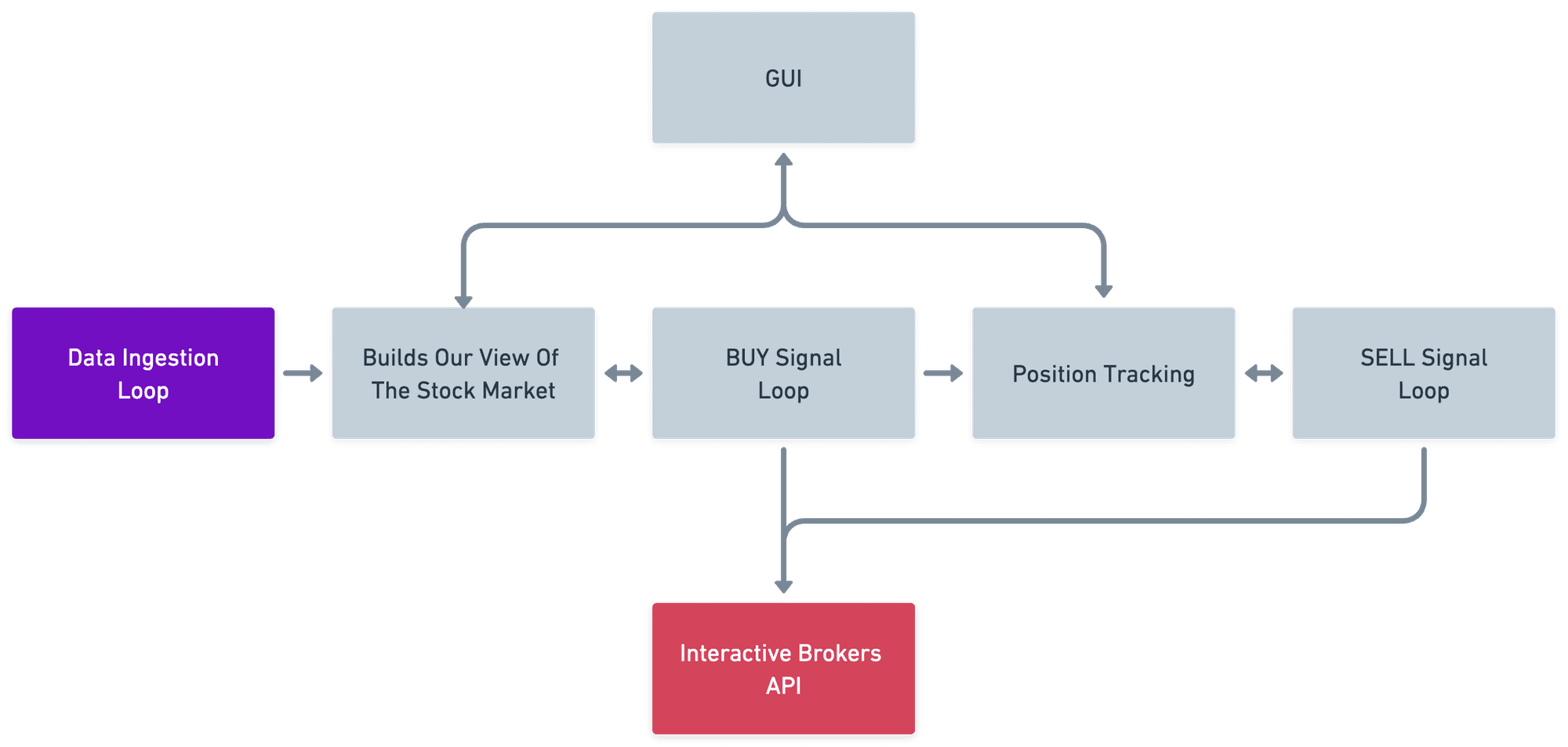 • Position Tracking System: Once trades are executed and we own stock, it's vital to monitor the positions. I consider this system like a vigilant shepherd overseeing its flock of positions. Essentially, it is a loop that continuously compares the position table with current prices, tracking gains and losses in real-time. There is also a GUI here where you can go and inspect the trade to see why it was triggered, what the current state is, and when it would sell. This has been instrumental in helping me refine the logic for the BUY and SELL loops.
