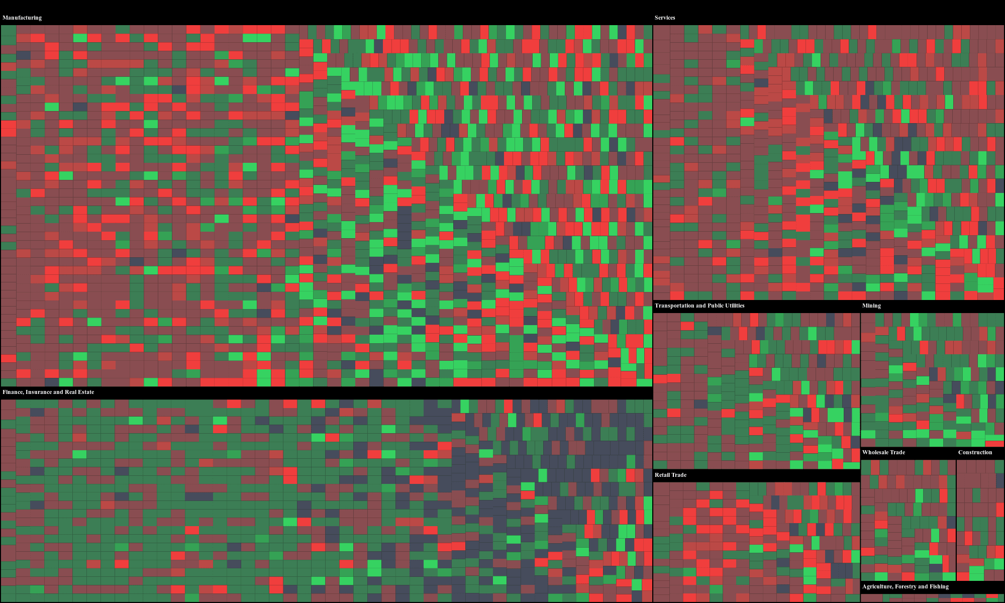 The logic of this SIC code-to-group enables us to transform a large dataset into a neatly structured visualization. This structured approach facilitates easy identification of market conditions, providing a snapshot of the market's overall health.