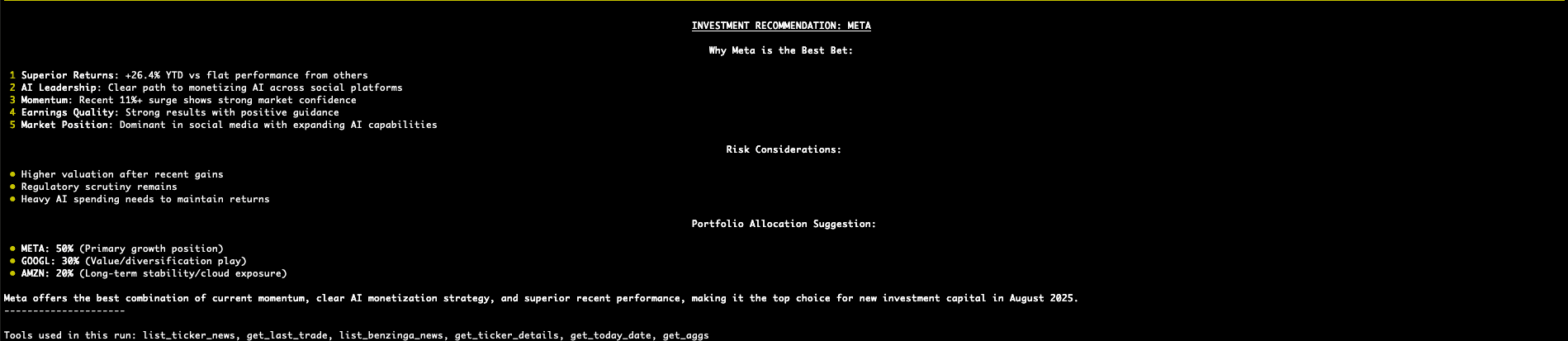 Thanks to the convergence of high-fidelity data, powerful AI models, and modern development frameworks, this is now possible. This tutorial will walk you through building a simple but powerful AI financial analyst. We'll use a stack that combines Massive.com's real time market data (via the Massive.com MCP server) with the reasoning capabilities of Anthropic's Claude 4, all tied together with the Pydantic AI agent framework.