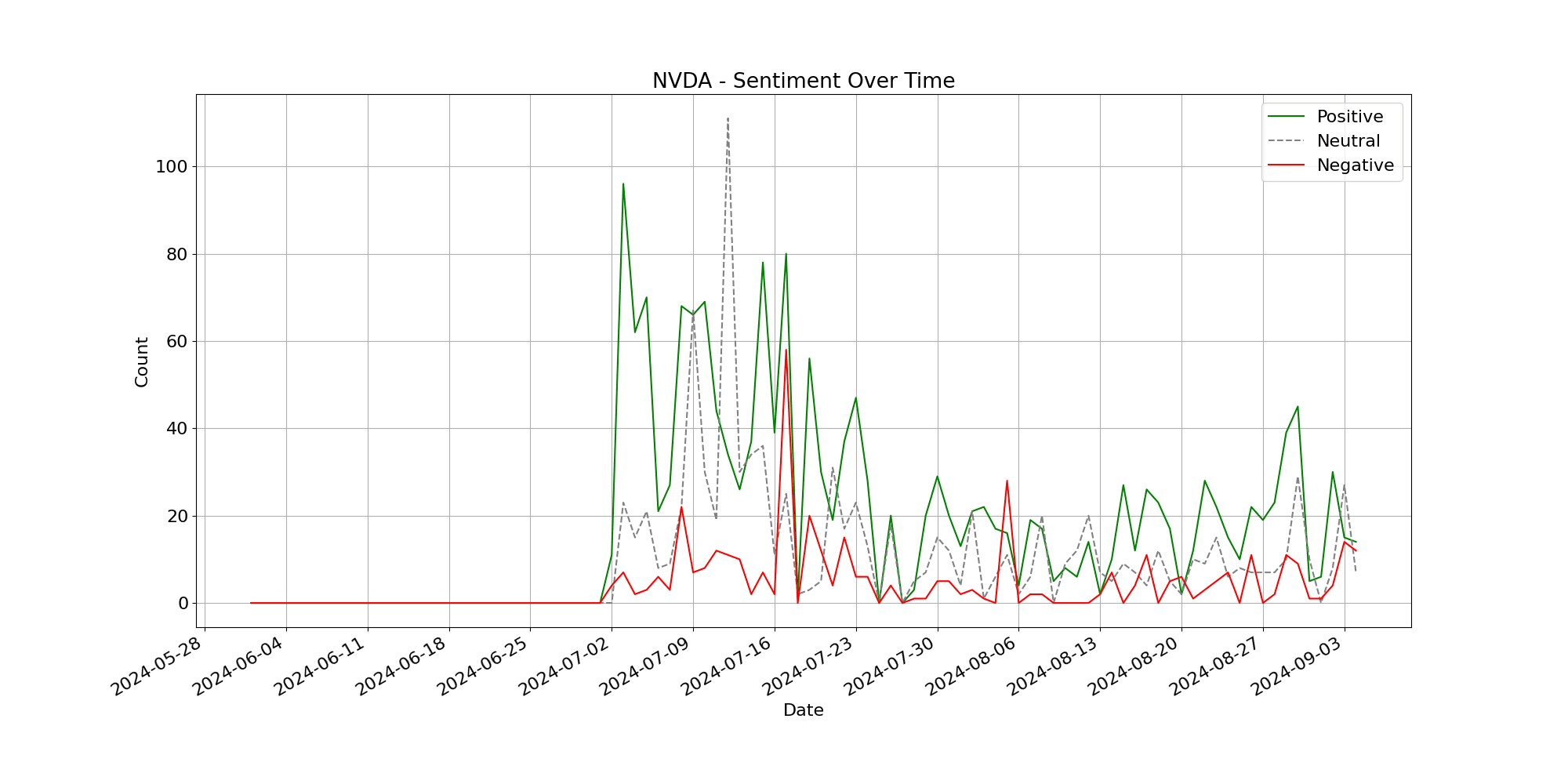 (NVIDIA) as our focus tickers. The results showcased distinct sentiment trajectories for each company, reflecting the different news events they each experienced.